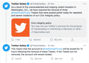 A medida tomada pelo Twitter é inédita com um presidente dos EUA. Provavelmente, é inédita com um comandante de qualquer nação no mundo. Desde as eleições presidenciais dos EUA em 2016, quando notícias falsas se espalharam rapidamente pela Internet, as redes sociais vêm sendo acusadas de negligência e passividade no controle desse problema. Facebook, Twitter e WhatsApp vêm gradativamente criando mecanismos para combater essa questão. No caso do WhatsApp, serve de exemplo as restrições para o encaminhamento de mensagens em massa. O Twitter, por sua vez, começou a incluir alertas em publicações que propagam mentiras, o que já havia sido feito com Trump várias vezes nos últimos meses. Ao bloquear por 12 horas a conta do presidente norte-americano, o Twitter subiu mais um degrau nessa batalha.