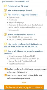 Para ter direito ao auxílio é preciso atender aos seguintes requisitos: ser maior de 18 anos; não receber benefício previdenciário, assistencial ou seguro-desemprego, nem qualquer outro programa de transferência de renda federal (à exceção do Bolsa Família, que, dependendo do valor, os beneficiados terão direito ao auxílio emergencial); ter renda familiar mensal de até R$ 522,50 por pessoa ou até R$ 3.315 no total; não ter recebido rendimentos tributáveis no ano de 2018 acima de R$ 28.559,70. Quem se encaixar nesses requisitos mas já fizer parte do Cadastro Único do governo federal não precisa se cadastrar de novo pelo app ou site. O processo de cadastro nesses canais é apenas para as pessoas que não fazem parte do Cadastro Único, em geral microempreendedores individuais (MEIs), contribuintes individuais do INSS e trabalhadores informais.