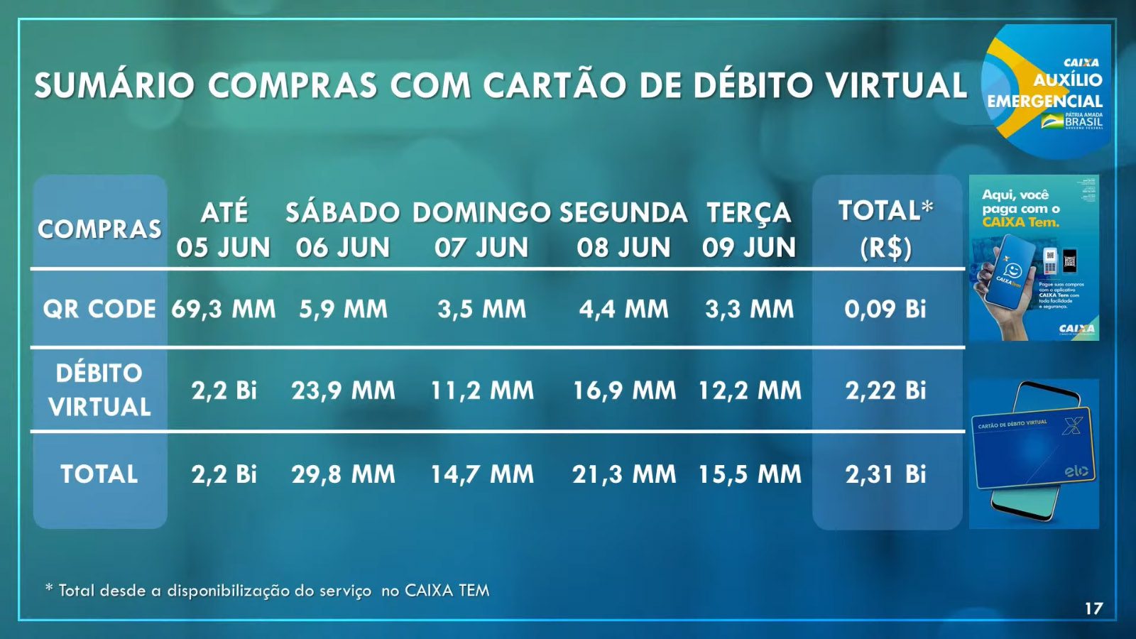 A Caixa registrou R$ 90 milhões de transações com QR Code através do app Caixa Tem, desde 29 de maio, quando a opção de pagamento foi disponibilizada aos beneficiários do auxílio emergencial do Governo Federal, até a última terça-feira, 9. O cartão de débito virtual soma R$ 2,22 bilhões de compras realizadas com a tarjeta, o que dá um total de R$ 2,31 bilhões em transações on-line. Para fins comparativos, os saques em ATMs somam R$ 304,4 milhões e um total de 458,9 milhões de transações.