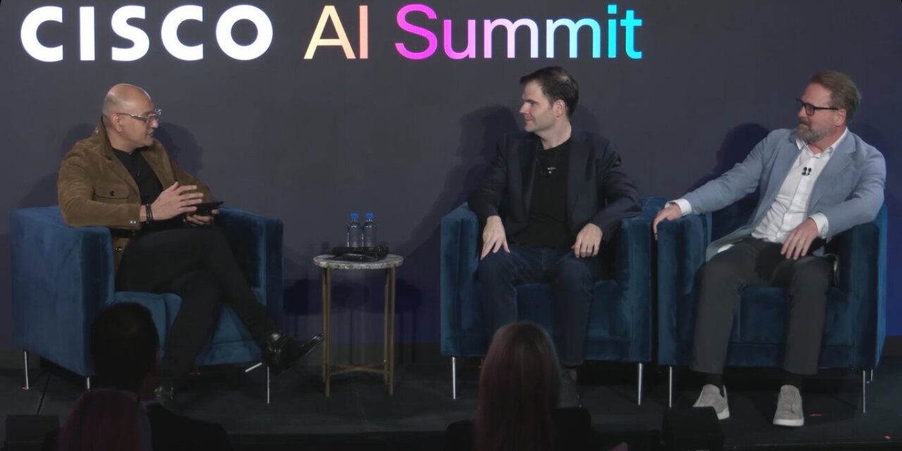 Imagem principal, da esquerda para direita: Jeetu Patel, VP da Cisco; Jonathan Ross, CEO da Groq; Martin Lund, VP da Cisco (reprodução/Cisco AI Summit)