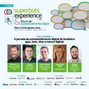 Albervan Luz vai participar de um painel sobre “A jornada de autoatendimento digital do brasileiro: apps, bots, sites e menus digitais”, durante o 10º Super Bots Experience & Fórum de Autoatendimento Digital, evento que acontecerá nos dias 7 e 8 de agosto, no WTC, em São Paulo, com organização de Mobile Time.